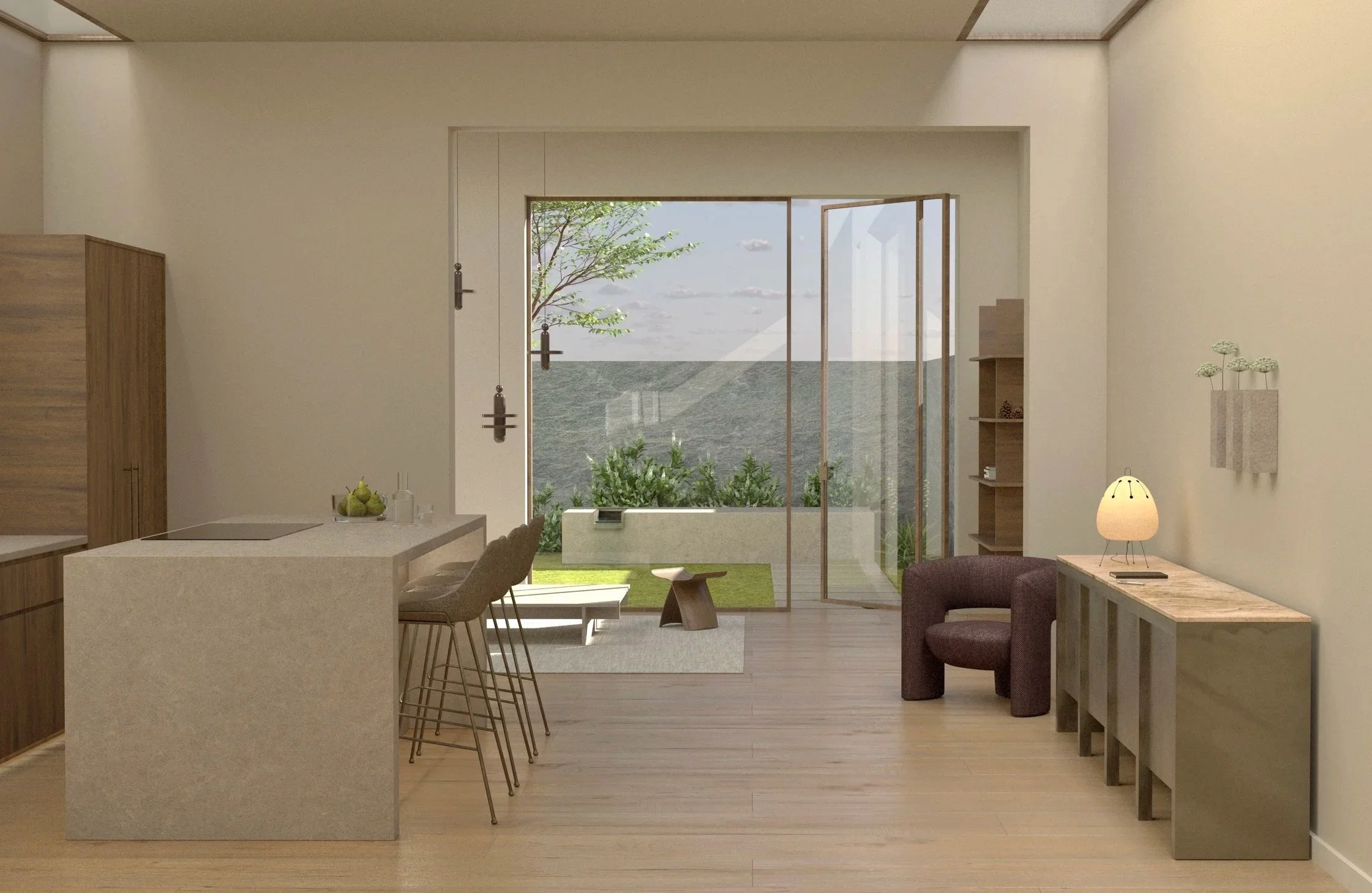 Complemented by the calming trickle of water, you’re drawn from the entrance to the patio, where the boundary between indoors and outdoors fades, creating an emotional experience that immerses you in nature and the home’s atmosphere.
