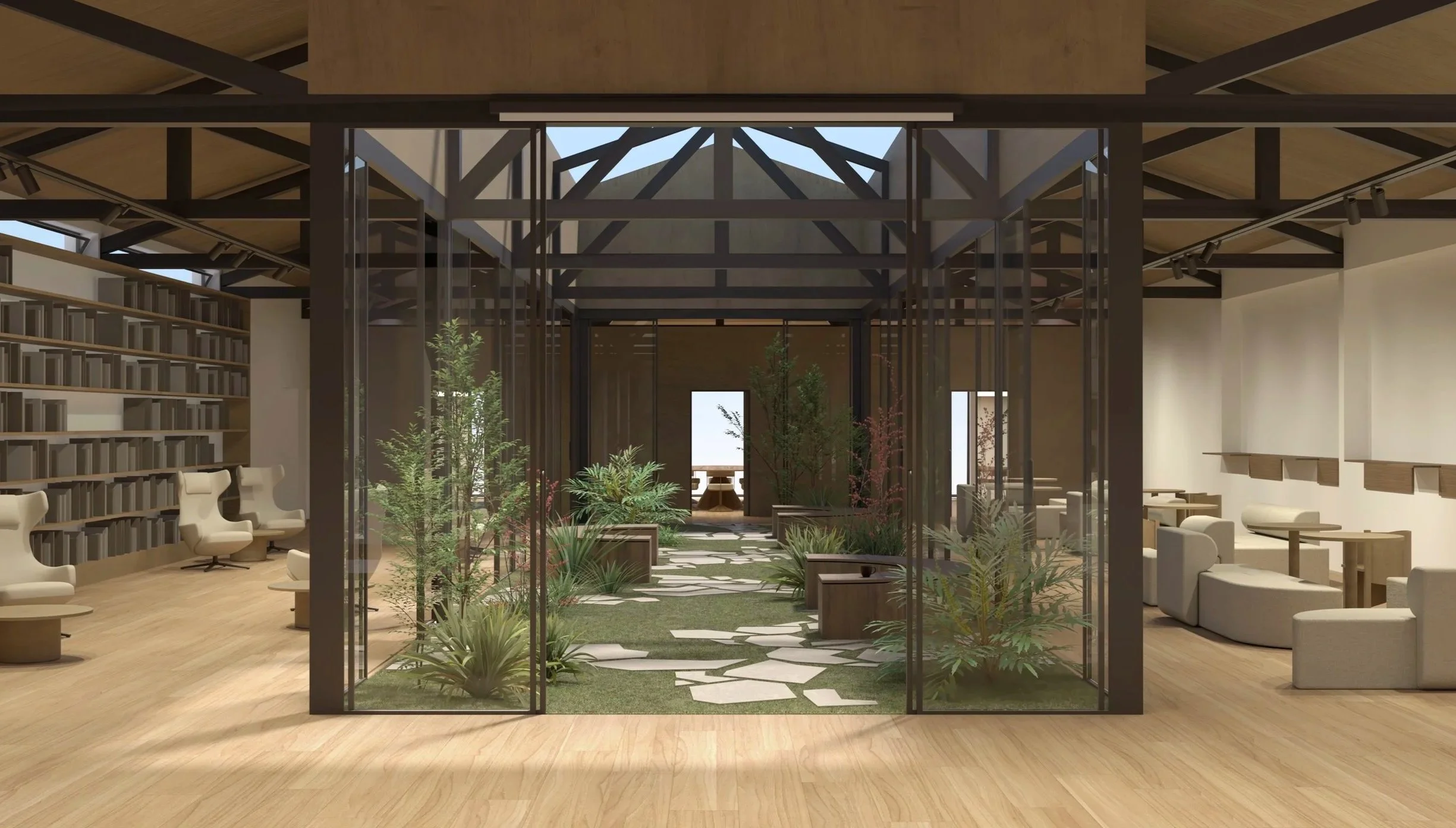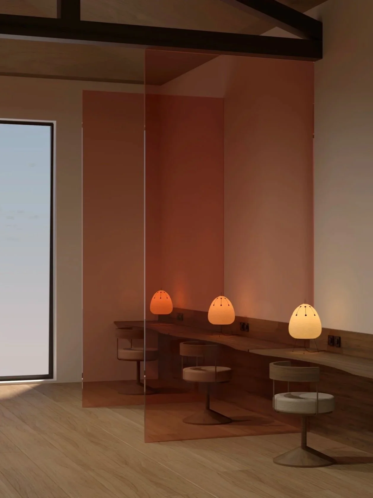 The office creates a ‘get away’ from the bustling city of Barcelona for a capacity of 20 people. It centres on a ceiling opening that creates a patio, seamlessly blending interior and exterior. Users can step outside to enjoy the sun or remain in the workspace with tranquil views of nature. Inspired by Peter Zumthor, the design emphasises atmosphere through light, materiality, and biophilia to foster a serene, focus-driven environment.